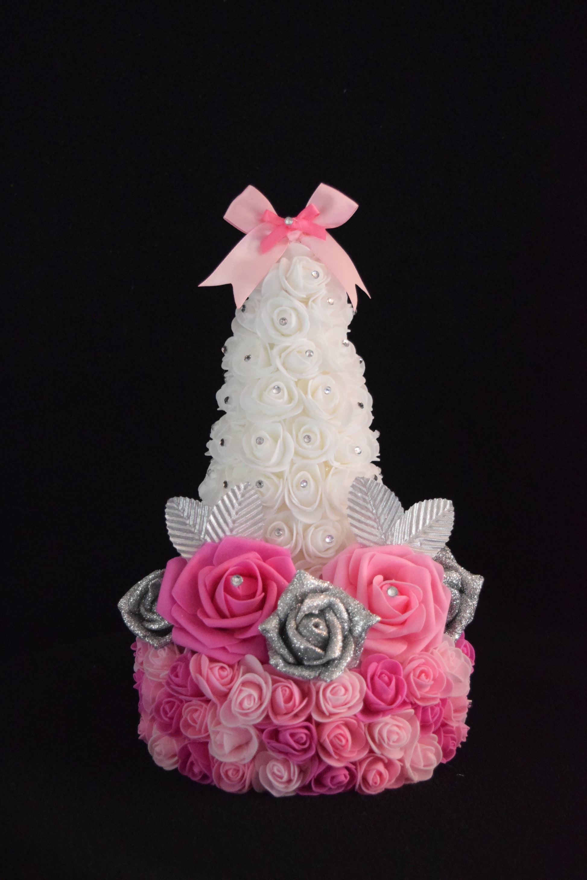Centre de table avec sapin est composé de petites roses, de grandes roses, de feuilles, de ruban et de strass.