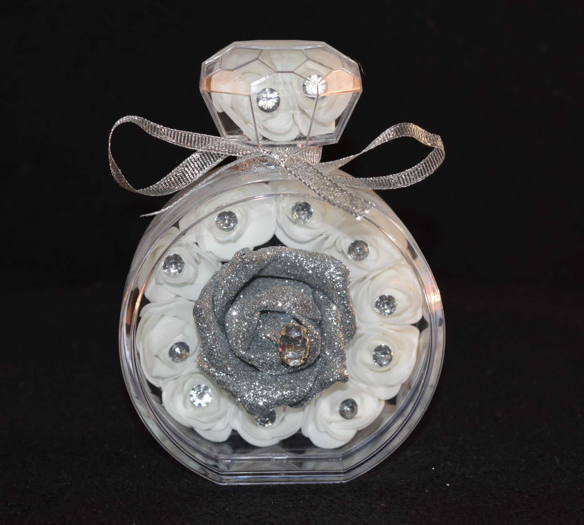 Flacon avec sa rose en mousse, des petites roses en mousse et son nœud en satin.