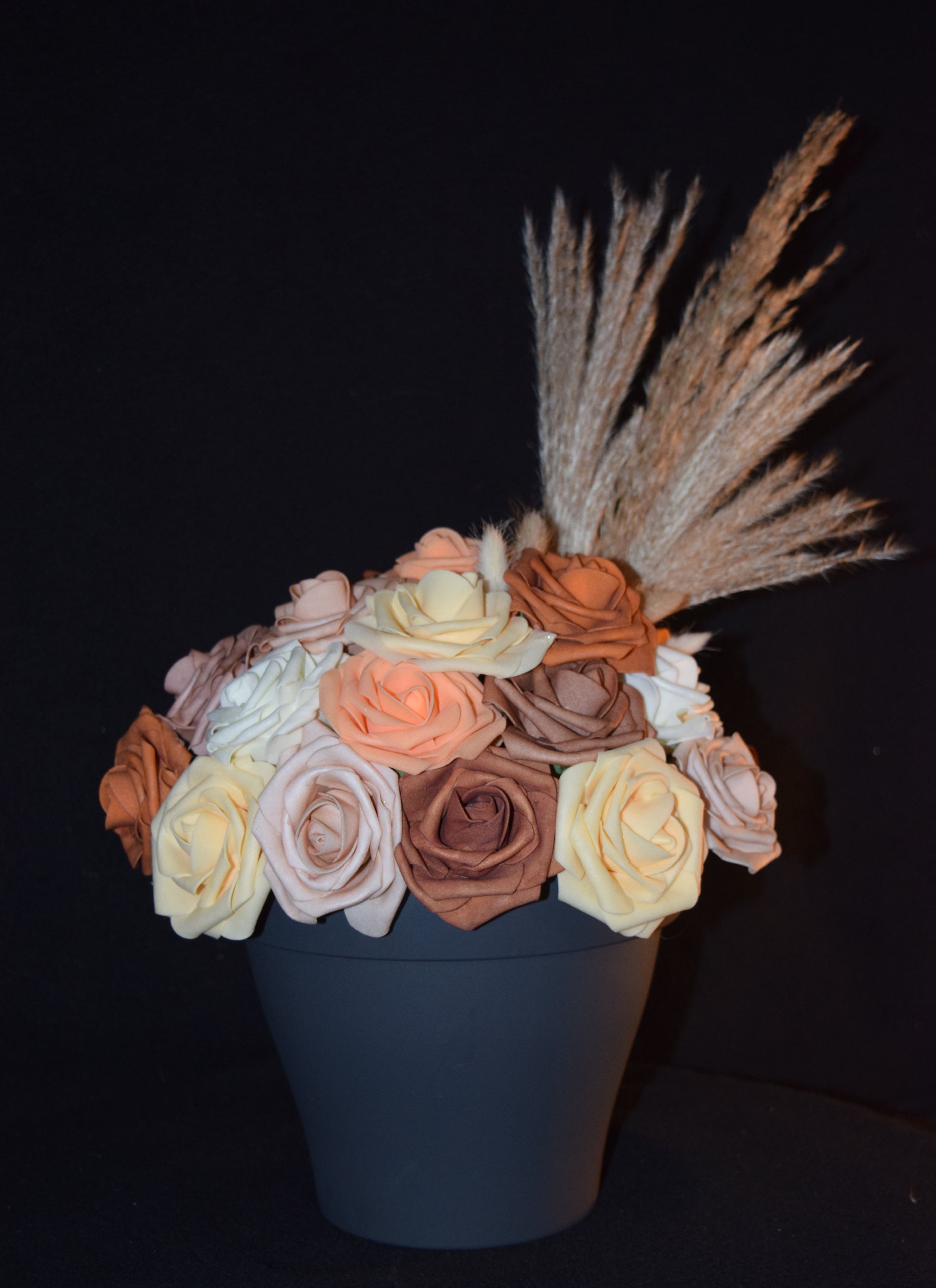 Pot floral de diamètre 21 cm qui est composé de différentes roses ou fleurs pompons ou le mixte des 2 sortes.